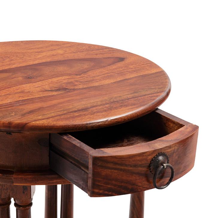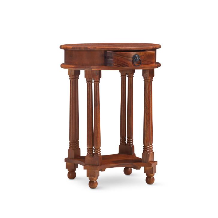 * Material: Solid Wood (Sheesham) * Colour: Natural * Style: Contemporary * Top Material: Solid Wood * Side Table Height: 23 inches (58 cm), Diameter: 17 inches (43 cm) * Delivery Condition: Assembled * Quantity: 1 Piece ( Side Table)0